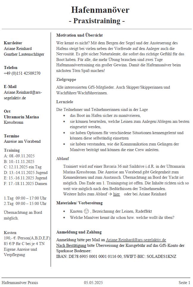 in der Mitgliederversammlung am 22.03.2025 hatten wir angekündigt, dass wir Hafenmanövertrainings im November 2025 am Bodensee durchführen wollen.